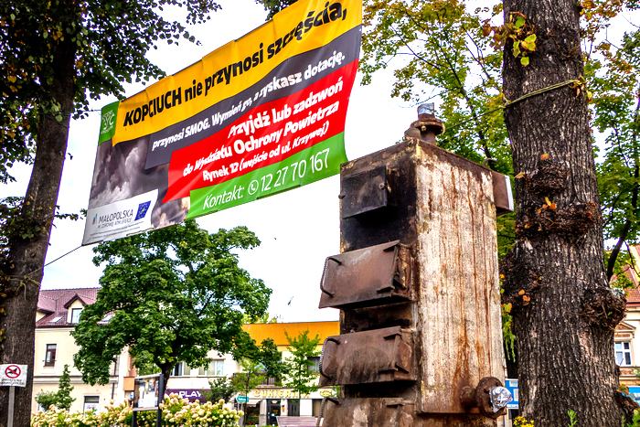 Na rynku w Skawinie pojawił się pomnik „kopciucha” – starego, nieekologicznego pieca węglowego. Urządzenie ma przypominać mieszkańcom o obowiązku jego wymiany do końca 2022 roku.