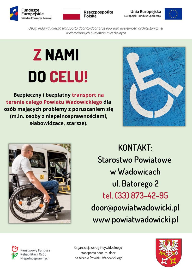 Projekt nosi nazwę „Otwarty Samorząd – Aktywny Mieszkaniec” – organizacja usług indywidualnego transportu door-to-door na terenie Powiatu Wadowickiego i jest finansowany ze środków Unii Europejskiej w ramach Programu Wiedza Edukacja Rozwój 2014 – 2020. Beneficjenci programu będą mieli zapewniony przewóz z miejsca zamieszkania do punktu docelowego, który wskażą np. do zakładów pracy, placówek służby zdrowia, gabinetów rehabilitacyjnych, urzędów bądź innych miejsc użyteczności publicznej.