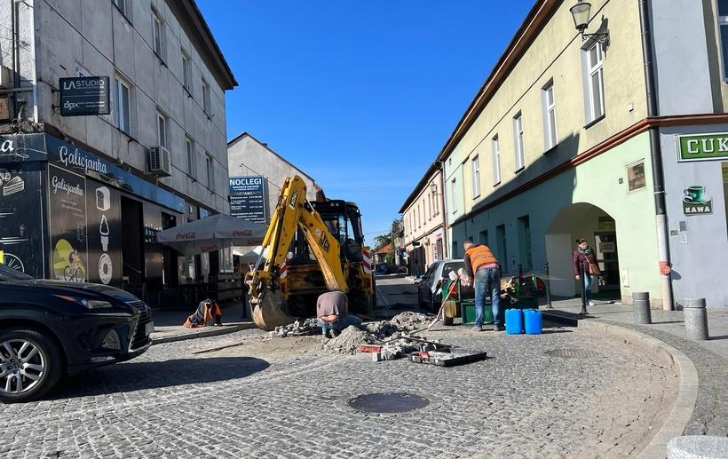 Z związku z tym, że w kostce brukowej pojawiło się zapadlisko, pracownicy budowlani znowu musieli przystąpić do naprawy. To już kolejna tego typu akcja w drodze przebiegającej przez rynek.
