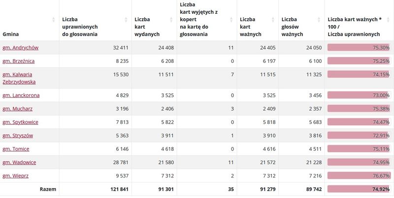 Jeśli patrzeć na dane Państwowej Komisji Wyborczej to w powiecie wadowickim mieliśmy frekwencję 74,92%. We wszystkich gminach frekwencja wyniosła sporo powyżej 70%. To oznacza, że każda z gmin do 20 tys. mieszkańców, a więc wszystkie w powiecie oprócz Wadowic i Andrychowa mogą liczyć na spore bonusy dla kół gospodyń wiejskich i na klub sportowy.