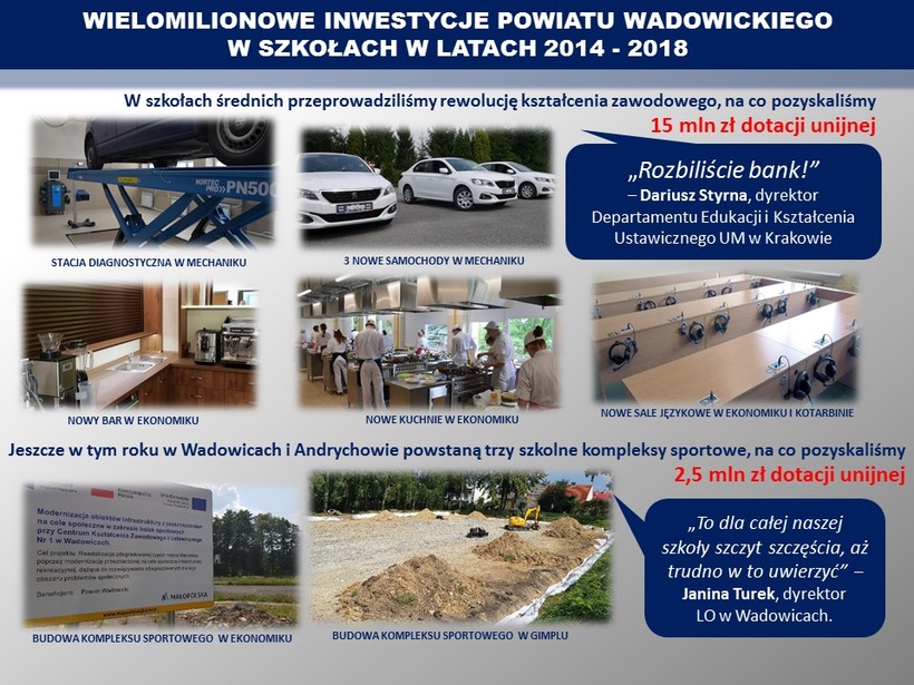 Przypomnijmy, że w minionym roku samorząd powiatowy wywalczył ogromne środki finansowe w wysokości blisko 15 mln zł na utworzenie trzech Centrów Kształcenia Zawodowego i Ustawicznego (CKZiU): dwóch w Wadowicach i jednego w Andrychowie. To najwyższa dotacja w całej Małopolsce (nie licząc Krakowa).