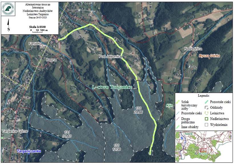 W celu zdobycia szczytu Jawornicy lub Potrójnej zalecamy skorzystanie z alternatywnego szlaku zaprezentowanego na poniższej mapie. Inną alternatywą zdobycia wspomnianych szczytów pozostaje rozpoczęcie podróży z miejscowości Rzyki – informuje Nadleśnictwo.