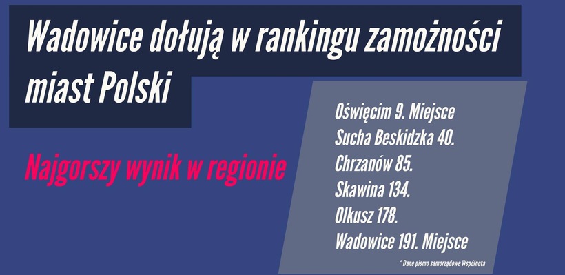 Niestety w Wadowicach nie jest dobrze z miejską kasą, a nawet jest gorzej niż przypuszczano. W rankingu miast powiatowych Wadowice spadły aż o 35 miejsc i są obecnie notowane na 191 miejscu w Polsce. Ranking miast powiatowych obejmuje 267 miejscowości. Dochód na jednego mieszkańca w 2016 w Wadowicach wynosił 2526,54 zł rocznie. Rok wcześniej dochód był co prawda niższy i wynosił 2518,74 zł, ale pozycja Wadowic wśród miast powiatowych była wyższa (156. miejsce).