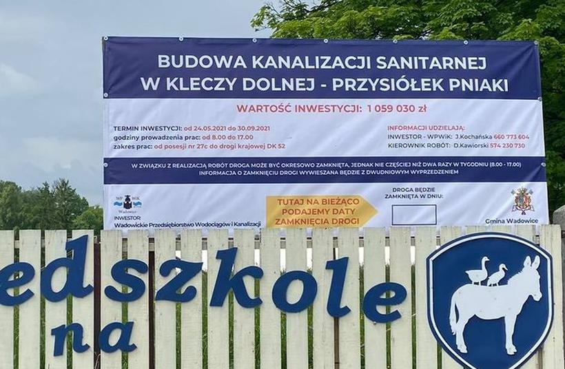 W związku pracami związanymi z budową kanalizacji w miejscowości Klecza Dolna – Pniaki, w dniu 20.08.2021 r. tj. piątek w godzinach od 8.00 do 16.00 droga w Kleczy Dolnej przysiółek Pniaki na wysokości wjazdu do Przedszkola na Kopcu będzie zamknięta – informuje nas Wadowickie Przedsiębiorstwo Wodociągów i Kanalizacji, które realizuje inwestycję.
