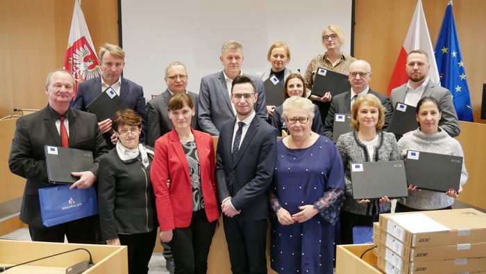 W czwartek (2.02) w Starostwie Powiatowym w Wadowicach uroczyście wręczono 111 laptopów przedstawicielom ośmiu szkół ponadpodstawowych przygotowujących do zawodu.
