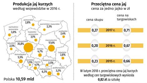 Według danych Głównego Urzędu Statystycznego ponad 35 proc. polskich jajek produkowanych jest w Wielkopolsce. Na drugim miejscu, z o połowę mniejsza produkcją jest województwo mazowieckie. Pozostałe regiony mają zaledwie kilkuprocentowy udział w rynku. Najmniej jajek pochodzi z woj. opolskiego (1,5 proc.).