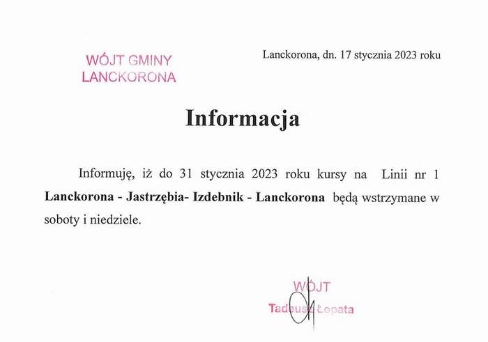 Od 10 stycznia tego roku na linii busowej Lanckorona – Jastrzębia – Izdebnik -Lanckorona ( Linia nr 1) kursuje bus, który wykonuje usługę transportu komercyjnie. To efekt negocjacji, które przeprowadził wójt Lanckorony Tadeusz Łopata z firmą przewozową, po tym, jak nie udał się kolejny przetarg na komunikację publiczną na tej trasie.