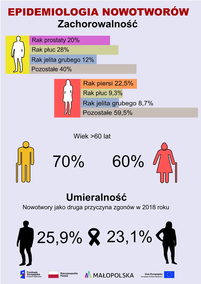 Nowotwory złośliwe stanowią drugą przyczynę zgonów. Z dostępnych danych wynika, że w 2018 roku odpowiadały za jedną czwartą zgonów mężczyzn i kobiet. Udział poszczególnych umiejscowień i typów nowotworów w zgonach zmienia się z czasem i jest zależny od płci. Szacuje się, iż blisko połowa populacji mężczyzn i ponad jedna trzecia populacji kobiet zachoruje na nowotwór w ciągu swojego życia. Nowotwory jelita grubego i odbytu w skali światowej stanowią trzeci pod względem częstości występowania nowotwór u mężczyzn oraz drugi u kobiet. Są odpowiedzialne na świecie za 8% zgonów nowotworowych, co stanowi czwartą najczęstszą nowotworową przyczynę zgonu na świecie Nowotwory złośliwe stanowią narastający problem zdrowotny, społeczny i ekonomiczny także polskiego społeczeństwa, przede wszystkim u osób w przedziale wiekowym 25–64 lat, a więc w wieku aktywności zawodowej. W Polsce od prawie trzech dekad obserwuje się wzrost liczby zachorowań (tj.: 4-krotny u mężczyzn i ok. 3-krotny u kobiet) oraz liczby zgonów (tj.: 6-krotny w populacji mężczyzn i 4-krotny w populacji kobiet). Do najczęściej rozpoznawalnych nowotworów należą: rak płuca, rak jelita grubego, rak piersi oraz rak prostaty. Wśród nich nowotworem o największej dynamice wzrostu jest rak jelita grubego. W populacji polskiej nowotwory jelita grubego i odbytu zajmują trzecie miejsce pod względem częstości występowania. Nowotwór jelita grubego rozwija się powoli. Zazwyczaj proces ten trwa kilkanaście lat. Bazą rozwoju są polipy wrastające do wnętrza jelita, składające się z niekorzystnie zmienionych komórek nabłonka jelita grubego. Nadmierny rozrost tych komórek i kolejne niekorzystne zmiany na poziomie genetycznym przyczyniają się do rozwoju zmiany nowotworowej. W konsekwencji rak jelita grubego rozwija się beż wzbudzania w nas jakichkolwiek podejrzeń. Objawy sugerujące wystąpienie raka pojawiają się, gdy proces chorobowy osiągnie zaawansowaną fazę. Objawy późne są objawami zaawansowanego procesu nowotworowego, tj.: postępująca utrata masy ciała, brak apetytu, gorączka, znużenie i osłabienie.