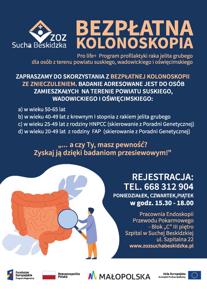 Zespół Opieki Zdrowotnej w Suchej Beskidzkiej realizuje projekt pn. Pro Life+ Program profilaktyki raka jelita grubego dla osób z terenu powiatu suskiego, wadowickiego i oświęcimskiego w ramach Regionalnego Programu Operacyjnego Województwa Małopolskiego na lata 2014-2020, 8 Oś Priorytetowa Rynek Pracy, Działanie 8.6 Wsparcie na rzecz wydłużenia aktywności zawodowej, Poddziałanie 8.6.2 Programy zdrowotne przy finansowaniu z Europejskiego Funduszu Społecznego.