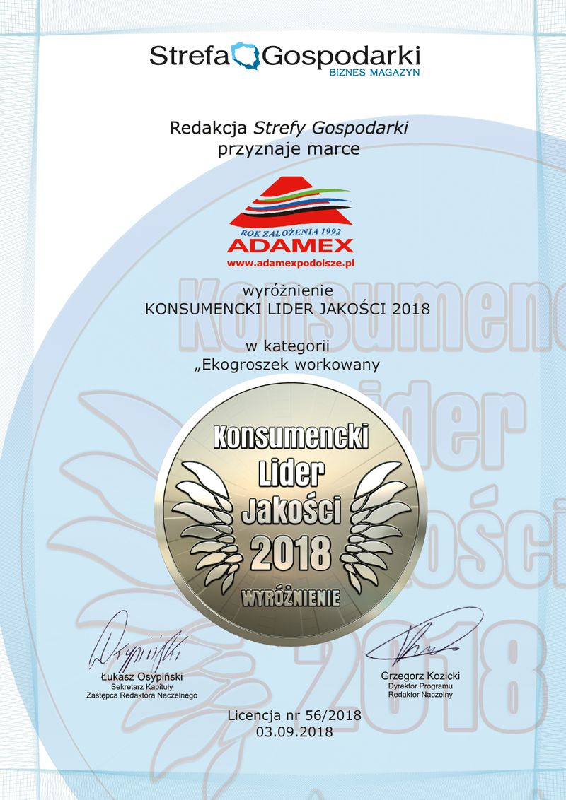 Jest nam niezmiernie miło poinformować Państwa, że głosami respondentów marka ADAMEX zdobyła wyróżnienie w kategorii „Ekogroszek workowany” w Ogólnopolskim Programie „KONSUMENCKI LIDER JAKOŚCI 2018″.