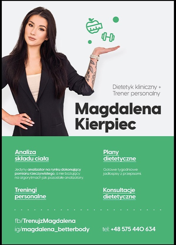 Magdalena Kierpiec – dietetyk, absolwentka Dietetyki klinicznej oraz Trener Personalny. Od 5 lat prowadzę prywatną praktykę, współpracując z pacjentami w gabinecie dietetycznym i prowadząc treningi personalne. Profil pacjentów jest bardzo szeroki – współpraca obejmuje zarówno sportowców, osoby z jednostkami chorobowymi, ale też kobiety w ciąży i przygotowujące się do ciąży. Uwielbiam ludzi i wyzwania!