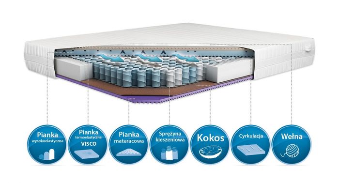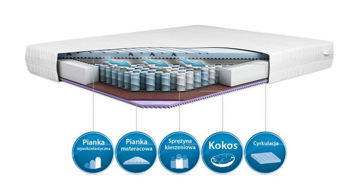– Jedna strona średnio miękka wykonana została z wysokoelastycznej pianki materacowej z unikalnymi 9-cio strefowymi konturowymi nacięciami, które w połączeniu z 9-cio strefowymi sprężynami kieszeniowymi tworzą system podwójnego strefowania, co pozwala nam cieszyć się niezrównanym komfortem snu i wypoczynku. Dodatkowo między sprężynami, a płytą została umieszczona specjalna przekładka materacowa, która tworzy formę seperacji między warstwami.
