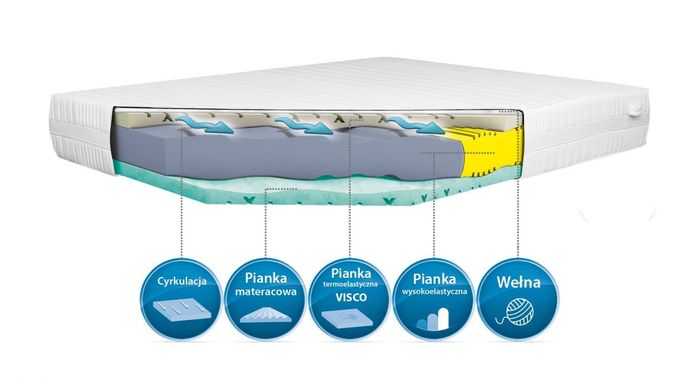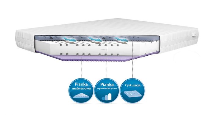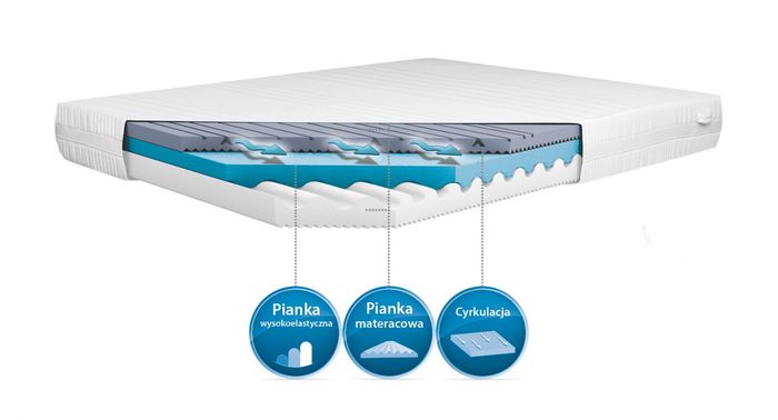 z wysokojakościową pianką materacową. Warstwa termoelastycznej pianki typu Visco posiada karbowaną powierzchnię, która wpływa korzystnie na poprawę komfortu snu. Kolejna warstwa specjalnej pianki materacowej z mikroszczelinami wspomaga działanie systemu cyrkulacji powietrza „STUDIO-M”.