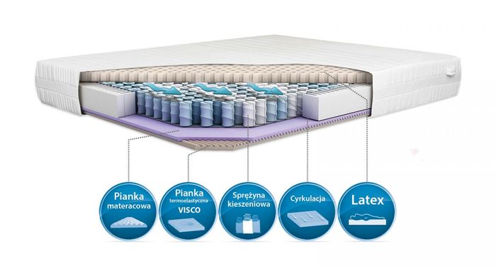 – Jedna strona średnio twarda powstała dzięki 6cm warstwie naturalnego lateksu, który zapewnia wysoką higieniczność, a specjalne otwory o naturalnej strukturze poprawiają wentylację. Strefy twardości sprężyny 9-cio strefowej gwarantują właściwe podparcie kręgosłupa zapewniając dobry sen.