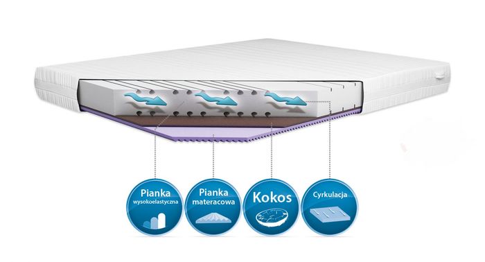 – Druga strona twarda powstała poprzez zastosowanie wysokogatunkowej pianki materacowej o karbowanej powierzchni, dodatkowo utwardzona warstwą naturalnego kokosu. Mata kokosowa utwardza materac, przy jednoczesnym zachowaniu jego elastyczności, zapewnia dobrą wentylację, pochłania wilgoć z otoczenia.