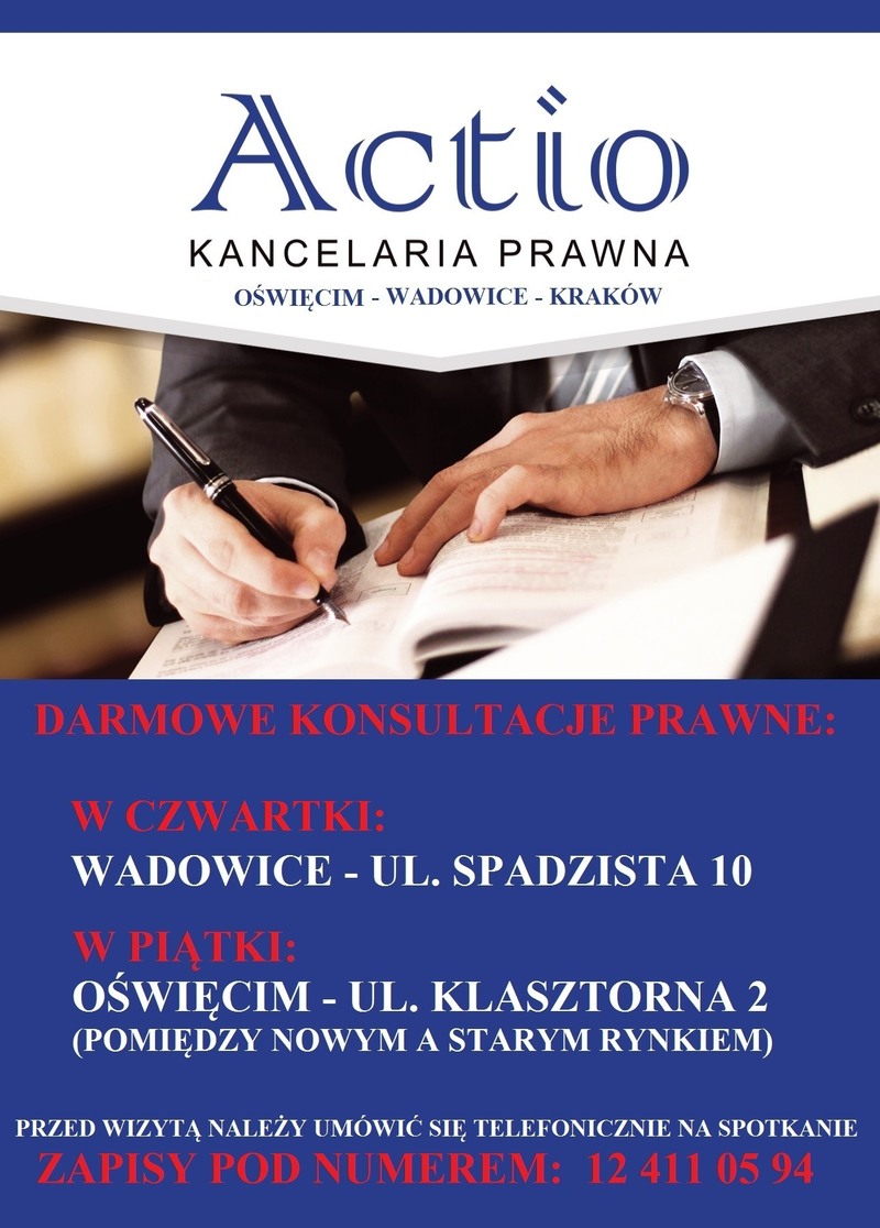 Zapraszamy w wybrane dni na bezpłatne porady prawne do Kancelarii Prawnej Actio z siedzibą główną w Krakowie oraz oddziałami m.in. w Wadowicach i w Oświęcimiu.