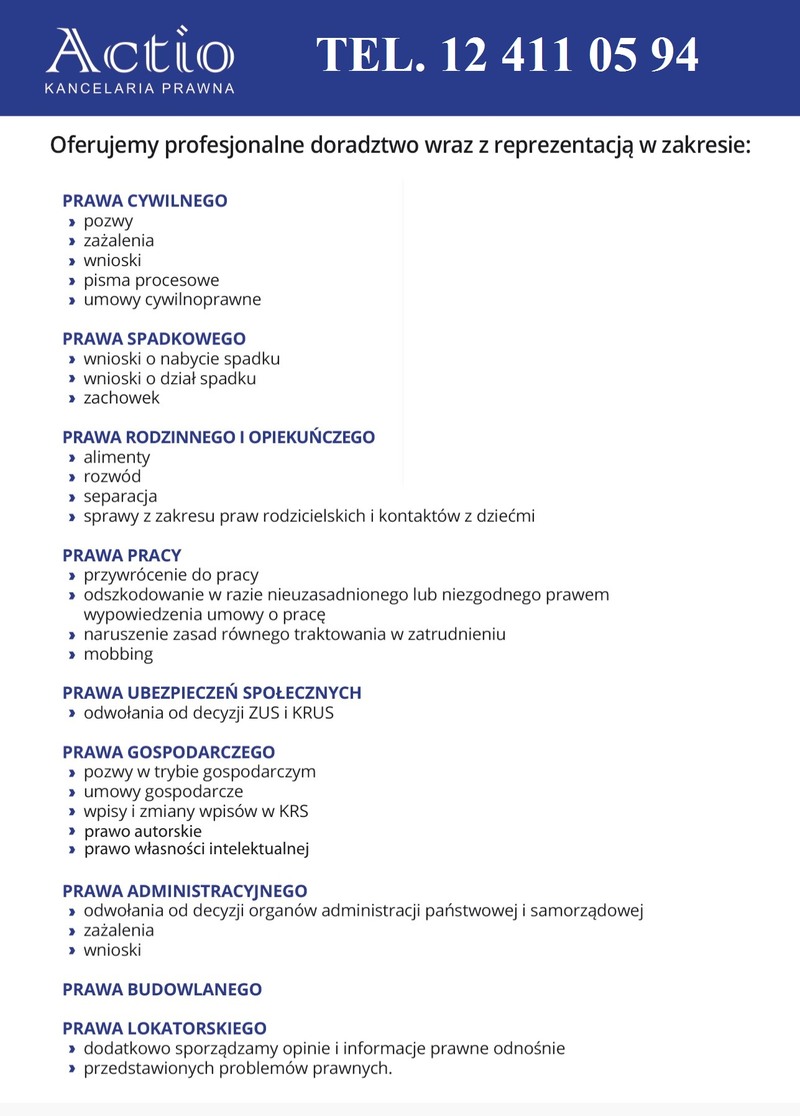 Kancelaria Prawna Actio zaprasza wszystkich zainteresowanych do kontaktu – już dziś zadzwoń na numer 12 411 05 94 i umów się na spotkanie z prawnikiem.