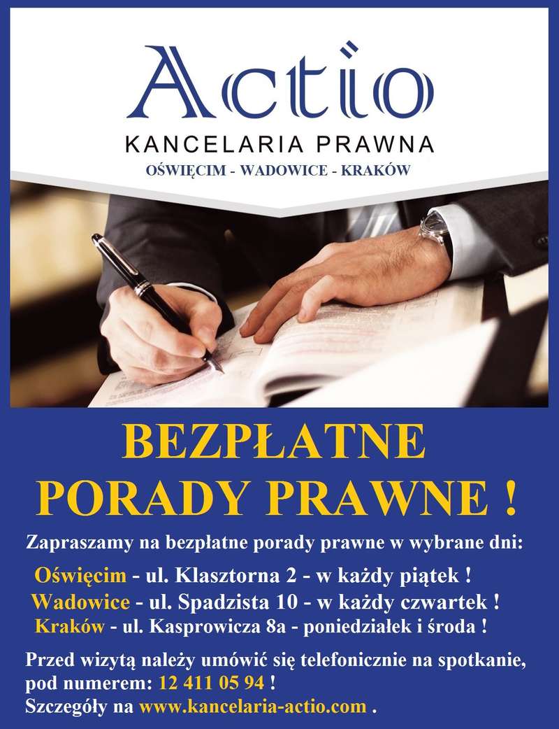 Zapraszamy wszystkie zainteresowane osoby, w wybrane dni, na bezpłatne porady prawne do Kancelarii Prawnej Actio z oddziałami w Wadowicach i Oświęcimiu oraz siedzibą główną w Krakowie.