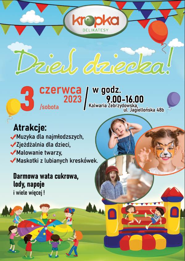 W sobotę (3.06) dzieciaki zaproszone są do Kalwarii Zebrzydowskiej pod Delikatesy Kropka. Przy ulicy Jagiellońskiej 48b zorganizowany zostanie Dzień Dziecka.