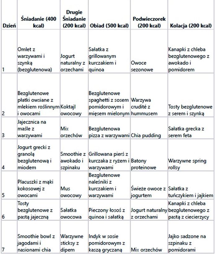 Poniżej znajduje się przykładowy jadłospis na 7 dni dla osoby na diecie bezglutenowej, z bilansem kalorycznym około 1500 kcal dziennie.