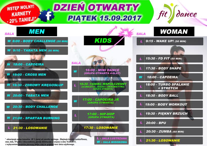 Już od 15 września 2017 swoje drzwi otwiera Fitdance Wadowice. W tym dniu wejście BEZPŁATNE dla kobiet, dzieci i UWAGA ….Mężczyzn. Tak dobrze czytacie……. od 15 września oferta zajęć grupowych i indywidualnych dla Panów.