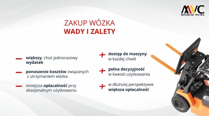 Sprzedaż wózków widłowych to jedna z głównych usług w ofercie firmy Movincar Polska. Jeśli jesteśmy zdecydowani na zakup maszyny, wystarczy skontaktować się z działem sprzedaży naszej firmy w celu ustalenia wstępnych szczegółów i umówienia spotkania, podczas którego możliwie najlepiej, wspólnie dopasujemy wózek do potrzeb Klienta. Skoro wiemy już, z czym wiąże się zarówno kupno i wynajem wózka widłowego oraz znane są wady i zalety każdej z tych opcji, czas na podsumowanie tematu!