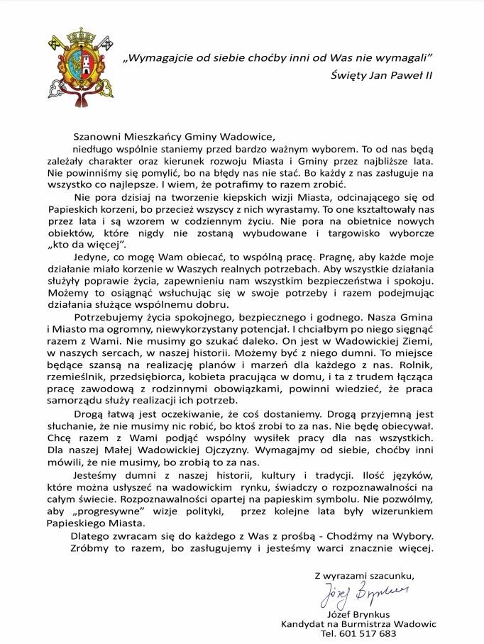 Nie będę obiecywał. Chcę razem z Wami podjąć wspólny wysiłek pracy dla nas wszystkich. Dla naszej Małej Wadowickiej Ojczyzny. Wymagajmy od siebie, choćby inni mówili, że nie musimy, bo zrobią to za nas – pisze w liście dr hab. Józef Brynkus.