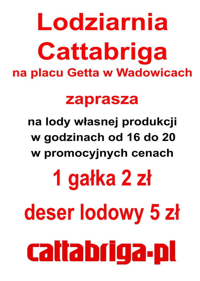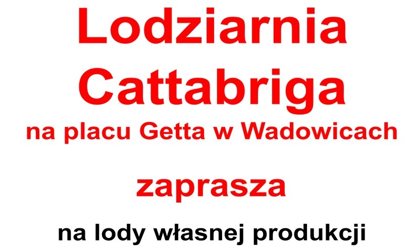 Lodziarnia Cattabriga w Wadowicach na placu Getta zaprasza na na lody własnej produkcji.