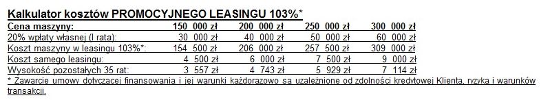 Zastanawiasz się, czy Ciebie lub firmę którą prowadzisz stać w tym momencie na zakup maszyny budowlanej?… Koniecznie poznaj naszą najnowszą ofertę!… Z pewnością zainteresują Cię niezwykle dogodne warunki PROMOCYJNEGO LEASINGU 103%*, takie jak: okres finansowania do 36 miesięcy, wpłata własna od 20%zobacz więcej. Nie daj się wyprzedzić innym, bowiem wspomniana promocja obowiązuje do 30 czerwca 2019 roku lub do wyczerpania zasobu maszyn!