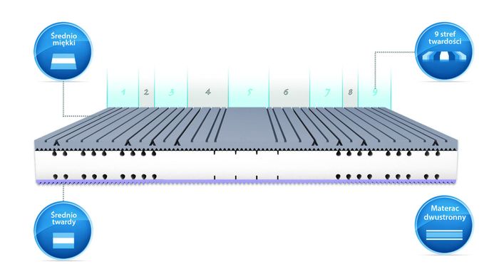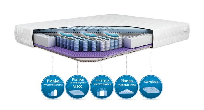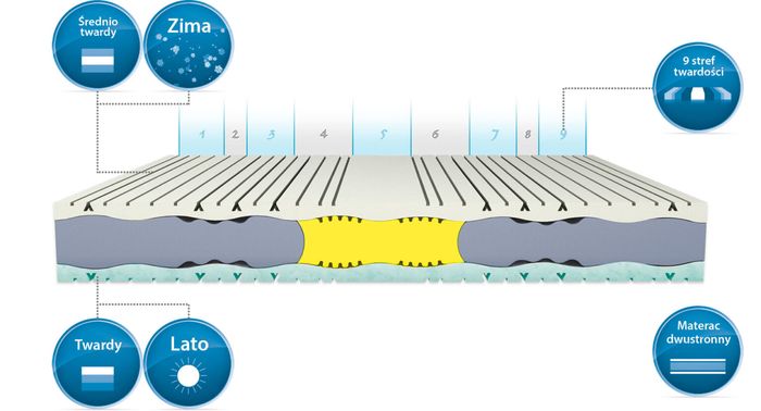– Satisfaction exclusive – również charakteryzujący się 9 strefami twardości. Wyposażenie w piankę termoelastyczną sprawia, że dopasowuje się do anatomicznej budowy ciała.