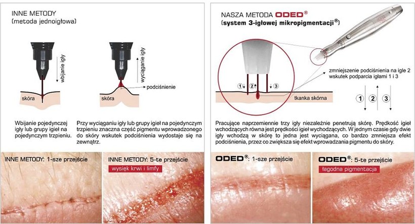 ODED jest to urządzenie, które w odróżnieniu do urządzeń innych producentów, opiera się na pracy trzech igieł naprzemiennie wchodzących w skórę. Mniej poraniona skóra lepiej i szybciej się goi, co z kolei wpływa korzystnie na zachowanie pigmentu w skórze i eliminację zabiegów korekcyjnych. Kiedy wszystkie igły penetrują skórę jednocześnie, powoduje to jej szarpanie i większy ból. Przy pigmentacji delikatnej skóry np. ust lub okolic oczu, jest to aspekt bardzo ważny.