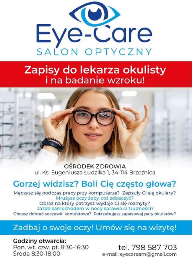 Salon Optyczny Eye-Care zaprasza na badanie wzroku. Salon mieści się w Centrum Medyczno-Rehabilitacyjnym (ośrodek zdrowia) na ul. Ks. Eugeniusza Łudzika 1 w Brzeźnicy ( nad kościołem, przedłużenie ulicy Kościelnej).