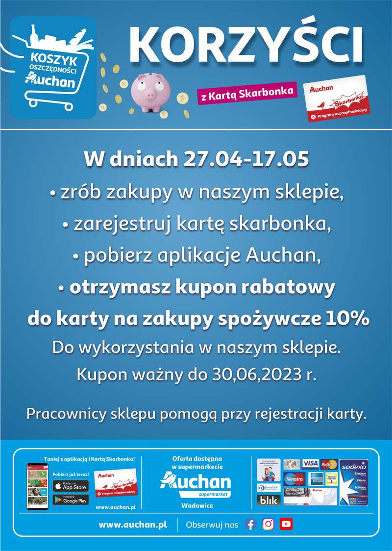 Od czwartku (27.04) rusza akcja „Korzyści z kartą skarbonka”. Co trzeba zrobić, aby z niej skorzystać? Jak informują w sklepie, należy zrobić zakupy, zarejestrować kartę skarbonka, następnie pobrać aplikację Auchan. Wówczas otrzyma się kupon rabatowy do karty na zakupy spożywcze 10%.