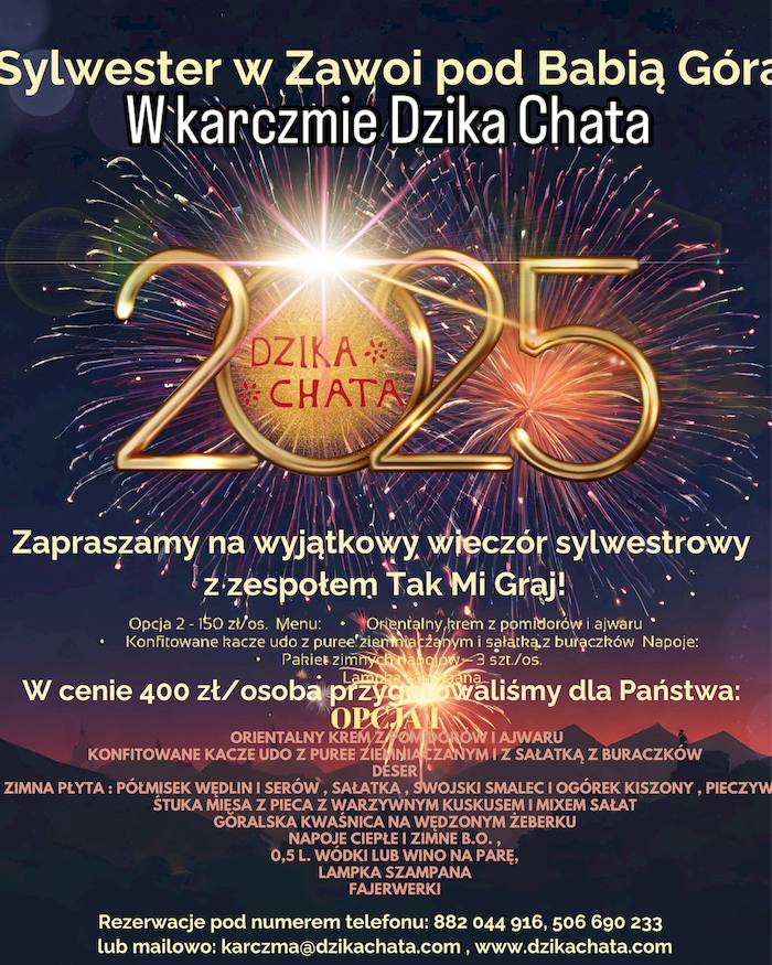 Zapraszamy do Karczmy Dzika Chata na wyjątkowy wieczór sylwestrowy, podczas którego przywitamy wspólnie Nowy Rok 2025.