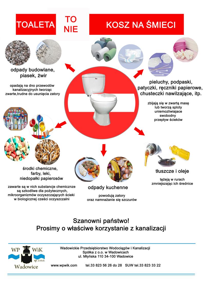 Każdego roku służby WPWiK Sp. z o.o. usuwają dziesiątki zatorów sieci kanalizacyjnej, awarii pompowni, powstających w wyniku wrzucania do kanalizacji substancji i przedmiotów, które nigdy nie powinny się tam znaleźć. Wiele z tych może doprowadzać do cofnięcia ścieków i zalania mieszkania, posesji lub ulicy. Takie zjawiska powodują nie tylko duże straty materialne, są uciążliwe dla mieszkańców i bardzo szkodliwe dla środowiska naturalnego, ale także powodują wzrost kosztów oczyszczania ścieków.
