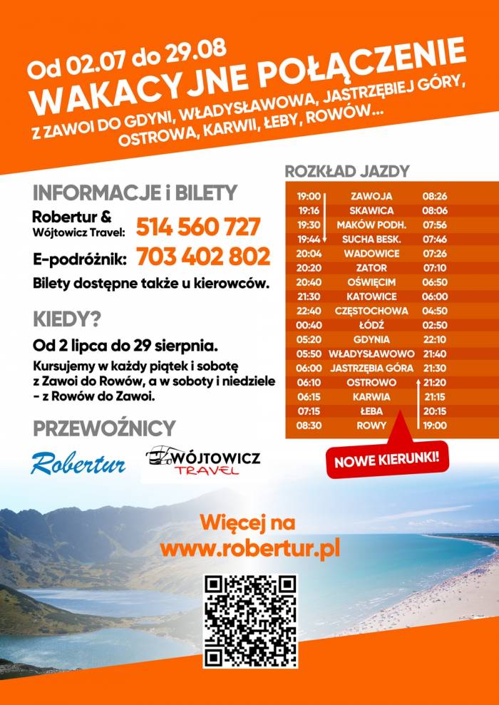 Firma Robertur z Zawoi we współpracy z firmą Wójtowicz Travel zapowiedziała uruchomienie w tym roku po raz kolejny wakacyjnej linii łączącej podbabiogórską Zawoję z nadmorskimi Rowami. Tegoroczne połączenie wyróżnia nowa trasa przejazdu, dzięki której będziemy mogli dotrzeć do większej ilości nadmorskich miejscowości.