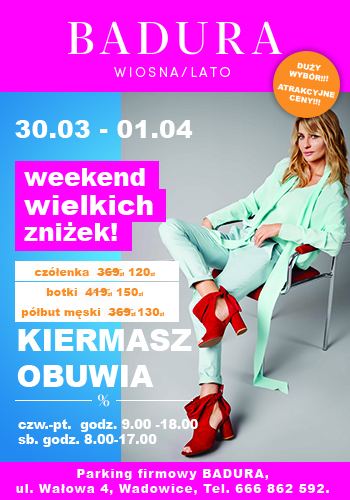 Kiermasz obuwia odbędzie się na parkingu firmowym Badura przy ul. Wałowej 4 w Wadowicach w dniach 30 marca – 1 kwietnia. Godziny otwarcia: czwartek i piątek (30 i 31 marca) w godz. 9:00 – 18:00, sobota (1 kwietnia) 8:00 – 17:00.