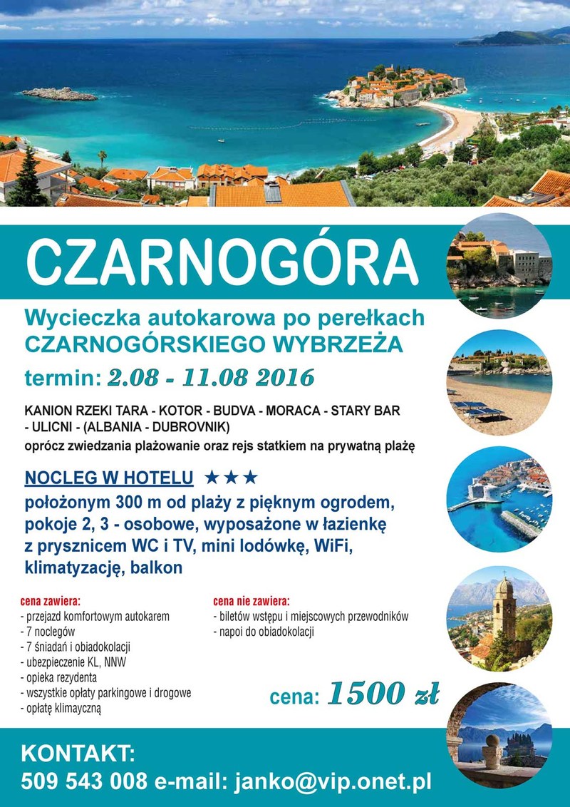 DZIEŃ 5 MONTENEGRO TOUR- wycieczka autokarowa po perełkach czarnogórskiego wybrzeża. Wyjazd ok.godz.9.00., przejazd Riwierą Barską i Budwiańską do Boki Kotorskiej (jednej z najpiękniejszych zatok na świecie wpisanej do światowego dziedzictwa kulturowego UNESCO). Zwiedzanie miasta z przewodnikiem, czas wolny. Następnie przejazd brzegiem zatoki do barokowego miasteczka Perast. Dalej rejs stateczkiem na malowniczo położoną w samym sercu Boki Kotorskiej wyspę Gospa od Skrpiela (Matka Boska na Skale)- zwiedzanie zabytkowego kościoła i muzeum morskiego. Następnie przejazd do jednego z najstarszych miast wybrzeża czarnogórskiego a zarazem największego kurortu – Budwy. Spacer urokliwymi uliczkami starówki, czas wolny. W drodze powrotnej fotopauza nad wyspą Św. Stefana. Powrót ok .godz. 18.00. Obiadokolacja, nocleg.