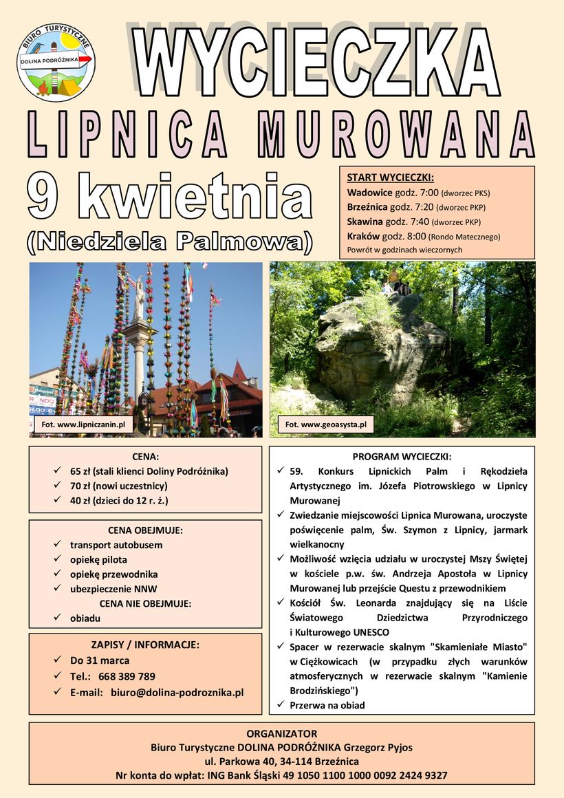 Niewątpliwą atrakcją w tym dniu będzie możliwość zobaczenia palm osiągających wysokość ponad 30 m! Będąc w Lipnicy Murowanej warto zobaczyć zabytkowy kościół Św. Leonarda znajdujący się na Szlaku Architektury Drewnianej województwa małopolskiego. Kościół ten jest na tyle cenny, że został również wpisany na Listę Światowego Dziedzictwa Przyrodniczego i Kulturowego UNESCO. Każdy z uczestników wycieczki będzie miał okazję uczestniczyć w uroczystym poświęceniu palm oraz w uroczystej Mszy Świętej w kościele p.w. Św. Andrzeja Apostoła. W ciągu dnia będą się odbywać na rynku imprezy towarzyszące: żywe warsztaty wykonywania palm, występy zespołów artystycznych, koncerty, jarmark wielkanocny. W godzinach popołudniowych uczestnicy wycieczki przejadą do Ciężkowic by tam wspólnie z przewodnikiem poznać podczas spaceru rezerwat skalny „Skamieniałe Miasto”. Zaplanowano również przerwę na wspólny obiad. Cały czas podczas wycieczki obecny będzie pilot i przewodnik udzielający cennych i ciekawych informacji.