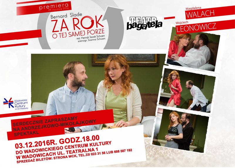 Teatr Bagatela zaprasza na andrzejkowo-mikołajkowy wieczór ze spektaklem „Za rok o tej samej porze” (Same Time, Next Year) w dniu 03.12.2016r. godz.18.00 do WADOWICKIEGO CENTRUM KULTURY!