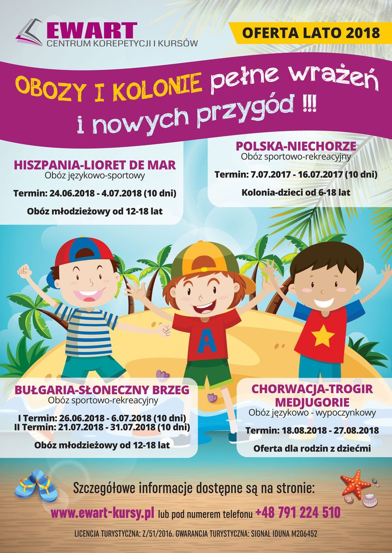 Zapraszamy do zapoznania się z ofertą letniego wypoczynku z EWARTEM. Obozy i kolonie pełne wrażeń i nowych przygód!!! OSTATNIE WOLNE MIEJSCA!