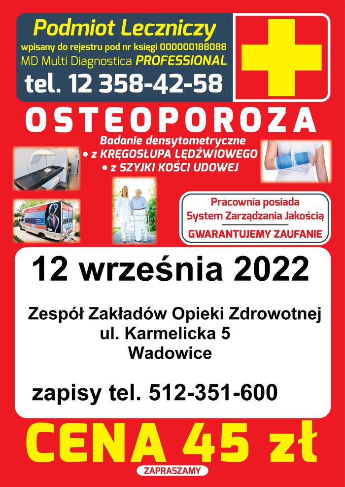 BADANIE OSTEOPOROZY: 12 września 2022 – Przy ZZOZ ul. Karmelicka 5 w Wadowicach
