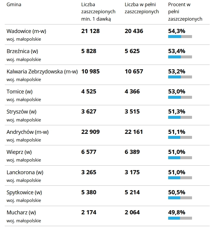 Na szczycie znajduje się gmina Wadowice przed Brzeźnicą i Kalwarią Zebrzydowską. W Wadowicach zaszczepiło się najwięcej, bo 54,3 procent populacji, a w Brzeźnicy 53,4 procent.
