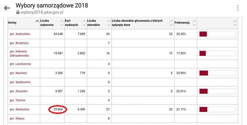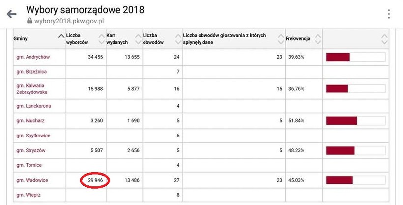 Jak podała Państwowa Komisja Wyborcza, na godz. 12 w niedzielę 4 listopada było ich w całej gminie dokładnie 29 804 osób. Tymczasem pięć godzin później liczba ta wzrosła o dziwo aż o 142 osoby i wyniosła o godzinie 17. już 29 946 uprawnionych do głosowania.