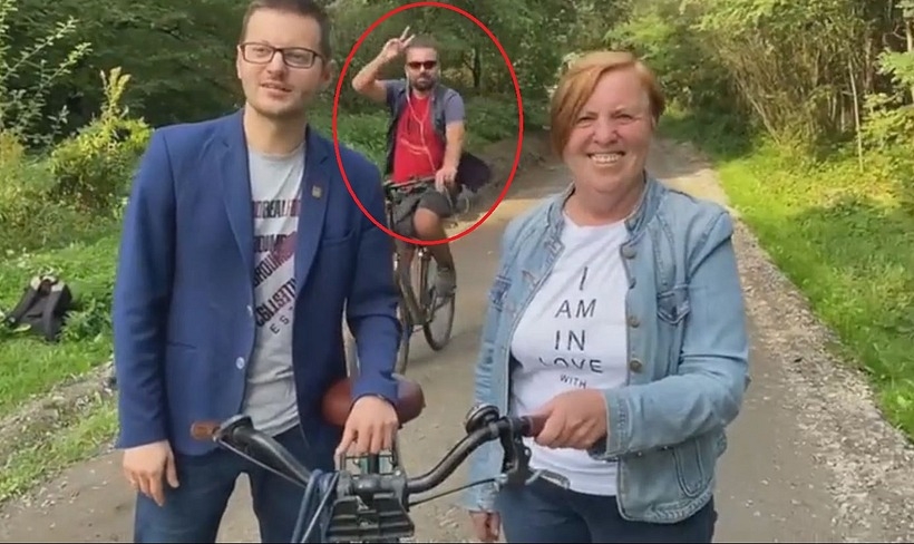 Rzeczywiście, w chwili gdy burmistrz nagrywał materiał zza pleców widać, jak ścieżkę testuje na rowerze radny Mateusz Klinowski, główny oponent Kalińskiego, który przegrał z nim wybory, ale jednocześnie wielki amator jazdy na rowerze. Klinowski jadąc na rowerze wykonał… „gest wiktorii”.