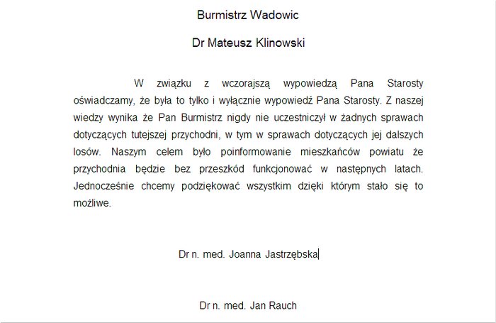 Sprawy ciąg dalszy. We wtorek do naszej redakcji Jan Rauch i Joanna Jastrzębska przesłali oświadczenie, które wysłali do burmistrza Wadowic Mateusza Klinowskiego. Poproszono nas, byśmy i my je opublikowali, co niżej czynimy.