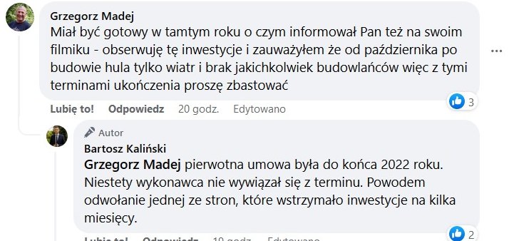 Miał być gotowy w tamtym roku, o czym informował Pan też na swoim filmiku – obserwuję tę inwestycje i zauważyłem że od października po budowie hula tylko wiatr i brak jakichkolwiek budowlańców więc z tymi terminami ukończenia proszę zbastować – napisał burmistrzowi Grzegorz Madej na ogólnodostępnym profili fejsbukowym samorządowca.