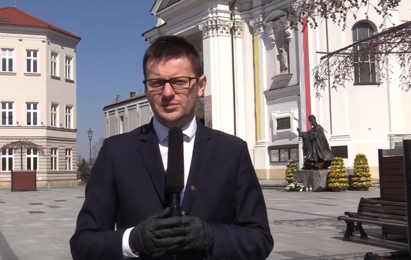 Na wadowickim w rynku, na tle pomnika Jana Pawła II i bazyliki Ofiarowania NMP burmistrz Wadowic Bartosz Kaliński zaopatrzony w czarne rękawiczki złożył mieszkańcom życzenia wielkanocne.