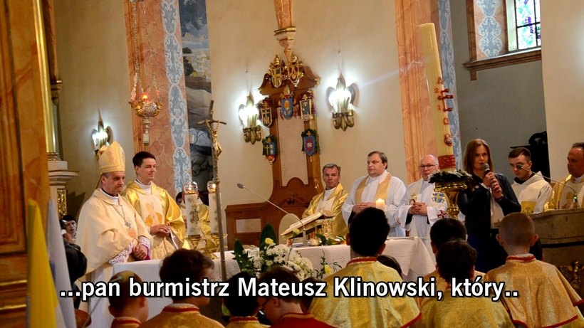 Wiceburmistrz Całus przed ołtarzem podlizuje się burmistrzowi Klinowskiemu. Reakcja biskupa natychmiastowa… w punkt!