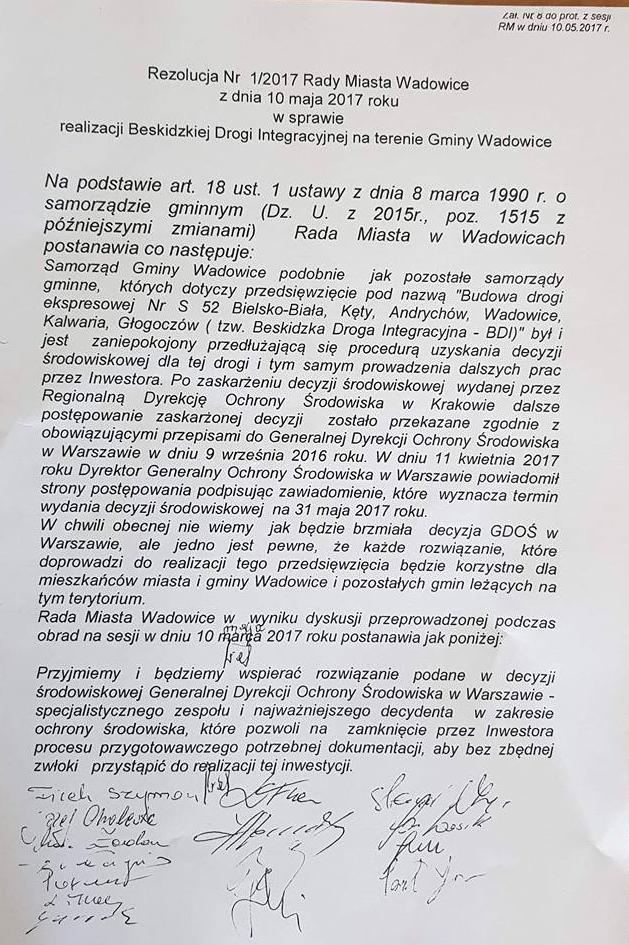 Starosta wadowicki przypomniał w piątek (17.08) uchwałę z maja 2017 roku, w której Rada Miejska w Wadowicach zajęła stanowisko w sprawie decyzji środowiskowej dotyczącej budowy drogi ekspresowej z Krakowa do Bielska-Białej (BDI).